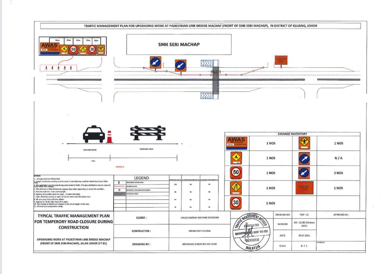 Kerja-kerja menaiktaraf Jejantas Sekolah Menengah Kebangsaan Seri Machap serta kerja-kerja berkaitan akan dilaksanakan di Daerah Simpang Renggam, Johor bermula pada:
