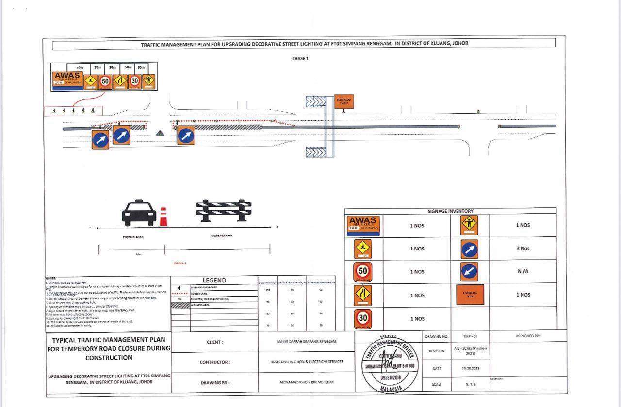 Dimaklumkan bahawa kerja-kerja menaiktaraf lampu jalan kepada lampu dekoratif serta kerja-kerja berkaitan akan dilaksanakan di Daerah Simpang Renggam, Johor bermula 28 September 2025 hingga 5 Disember 2025.